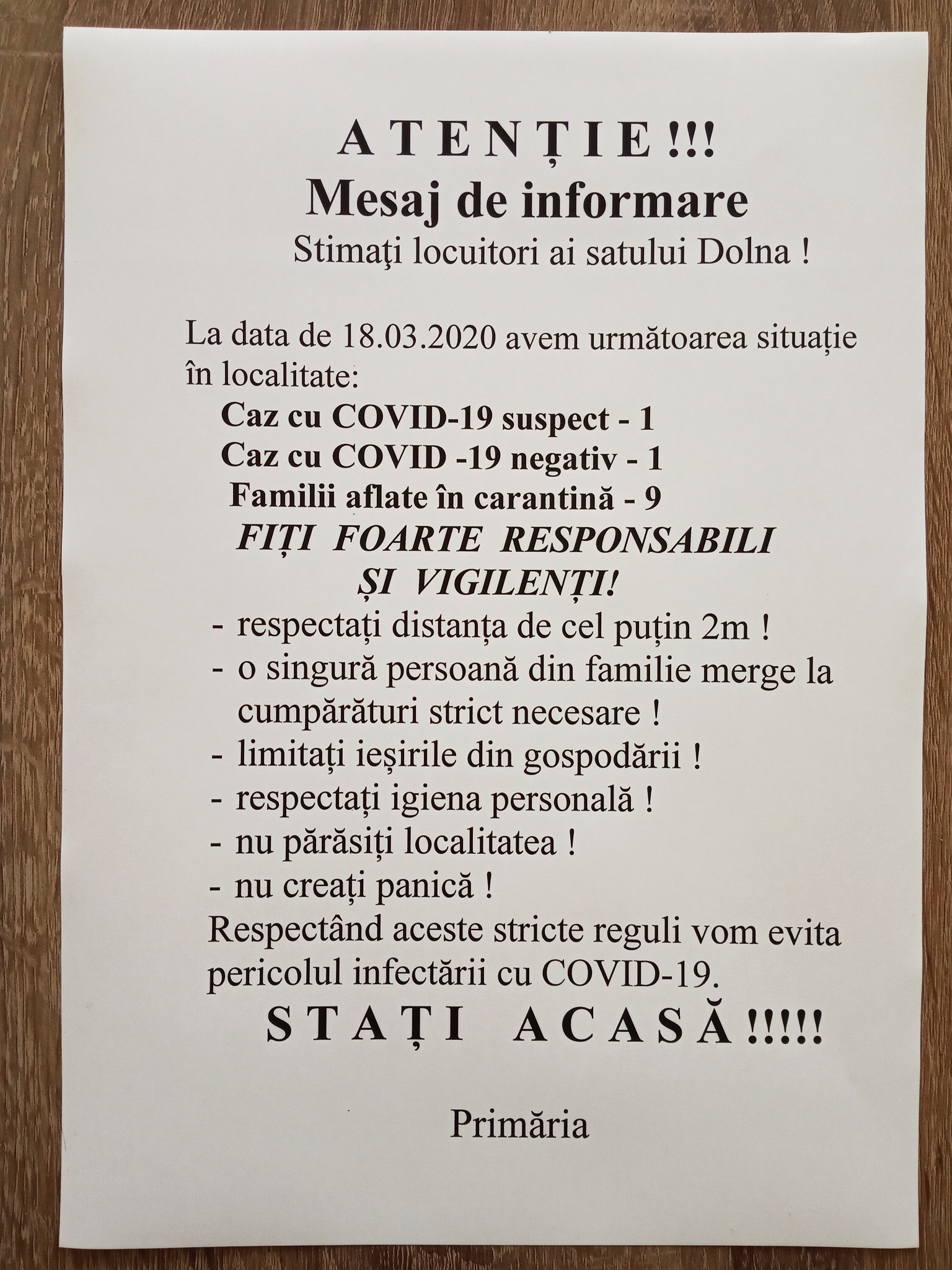 Mesaj de informare pentru locuitorii s. Dolna !!!