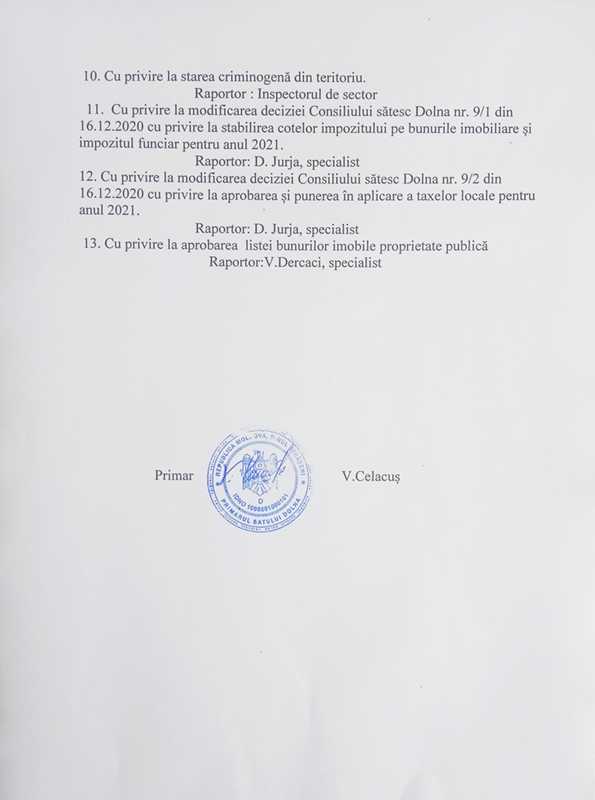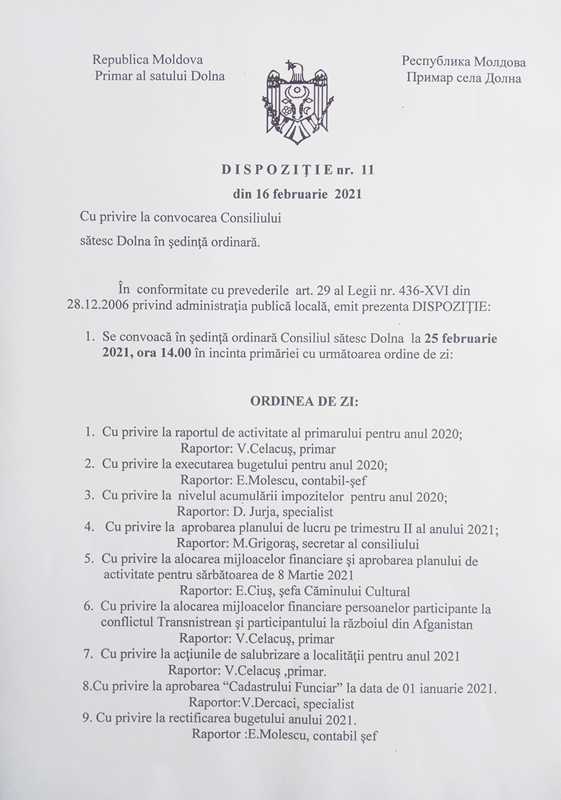 La data de 25.II.2021, ora 14.00, în sala de ședințe a primăriei, va avea loc ședința ordinară  a Consiliului sătesc Dolna.