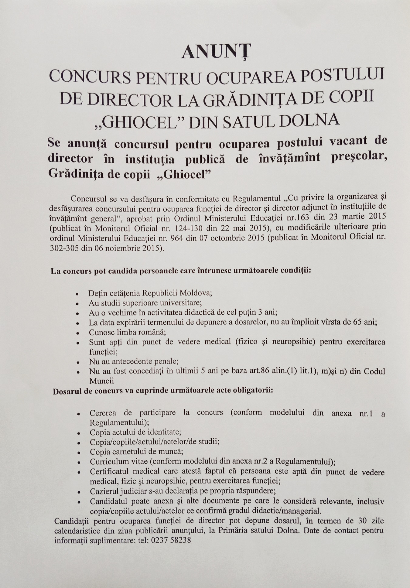 Se anunță concursul pentru ocuparea postului vacant de director în instituția publică de învățământ preșcolar, Grădinița de copii „Ghiocel” satul Dolna
