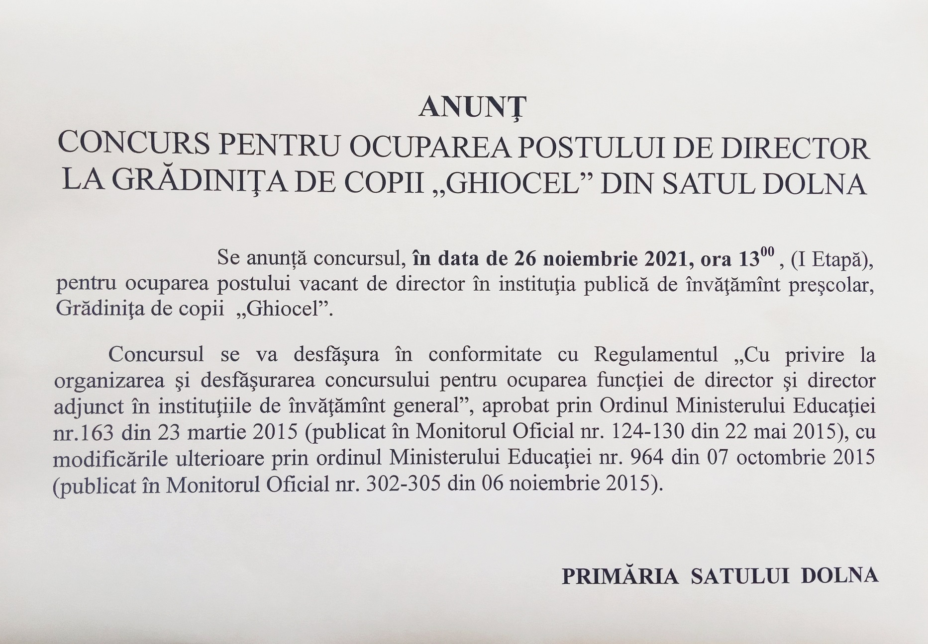 Se anunță concursul pentru ocuparea postului vacant de director în instituția publică de învățământ preșcolar, Grădinița de copii „Ghiocel” din satul Dolna
